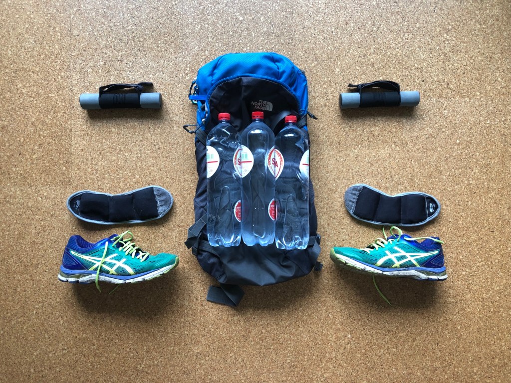 Hardlopen met gewichten, door een tekort aan bergen ben ik met gewichten gaan rennen. Ik begon met een halve kilo aan elke voet, onderhand is dat 10 kilo verdeeld over voeten, handen en rug. Als een buffel ren ik nu 10 kilometer met 10 kilo.